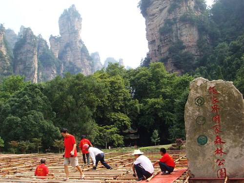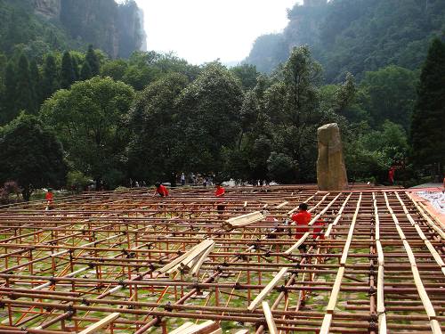 2008中國湖南國際旅游節(jié)開幕式舞臺位于世界自然遺產張家界國家森林公園老磨灣,根據導演組的舞臺美術設計,分為主體演出舞臺和方陣舞臺,總面積1600多平方米,總共將容納1600人同臺演出。其中主體舞臺長40米、深度為31.5米、高1.5米,方陣舞臺為42米長、深度9.5米、最高達10.5米的弧型階梯式舞臺。整個工程共需要使用25噸左右的鋼管,舞臺表面每平方米能夠承重600公斤以上。