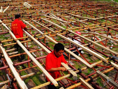 2008中國湖南國際旅游節(jié)已經進入倒計時,作為本次活動重頭戲的開幕式演出節(jié)目正在進行緊張的排練,而備受關注的開幕式舞臺工程到底建設進度如何?8月13日,據承建單位張家界喜洋洋文化傳播有限公司工作人員介紹,開幕式舞臺工程已完成1/3,現(xiàn)正進行第二表演區(qū)的鋼管搭建和木板鋪設,其它各項工程進展順利,能在8月25日如期接受組委會驗收。