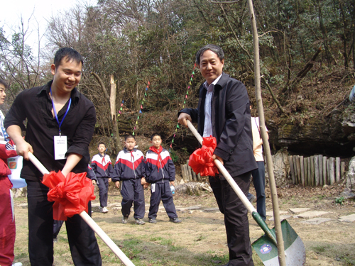 天門山公司董事長(zhǎng)張同生與奧運(yùn)冠軍樂茂盛一起為天門山再添新綠