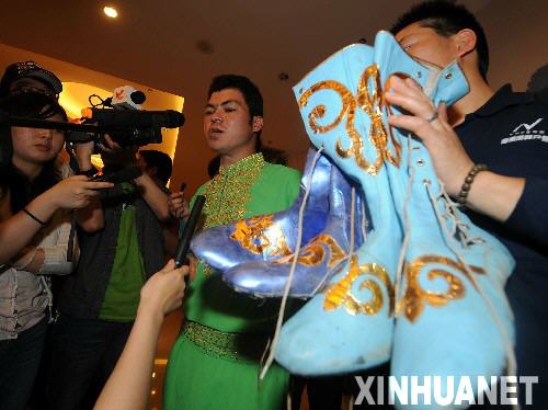 4月24日,新疆“達瓦孜”傳人賽買提·艾山在新聞發(fā)布會上接受采訪。當日,賽買提·艾山在新聞發(fā)布會上宣布,他將于25日在張家界天門山景區(qū)再次進行高空大斜度走鋼絲極限挑戰(zhàn)。今年24歲的賽買提·艾山是新疆“達瓦孜”第七代傳人,已經(jīng)創(chuàng)造了高空鋼絲倒立時間最長、倒走距離最長以及坡度最陡三項吉尼斯世界紀錄。 新華社記者龍弘濤攝