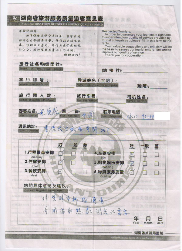 香港梁艷顏一行6人旅游質(zhì)量回饋