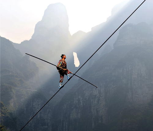 2008年10月,新疆達瓦孜絕技第七代傳人賽買提·艾山在天門山進行了空前難度的極限坡度高空走鋼絲行走挑戰(zhàn)。鋼絲架設(shè)在天門山奇峰絕嶺間,長700米,傾斜度達39°。此次挑戰(zhàn)的難度之大超乎想象,被眾人視為不可能完成的任務(wù)。賽買提最終功虧一簣,在離終點約60米處跌倒,但其勇氣和絕技令眾人折服。2009年4月,賽買提英雄歸來,再次挑戰(zhàn)這條鋼繩并終于成功,在天門山創(chuàng)造出世界高空鋼絲行走最具難度和風(fēng)險的一次極限征服。