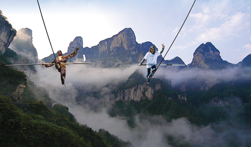 2010年3月20日,世界最優(yōu)秀的高空王子瑞士人弗雷迪·諾克與賽買提·艾山在坡度超過40度且極其光滑的天門山高山索道鋼繩上展開了一次驚天對決,兩位曠世高手聯(lián)袂上演出一次空前難度和驚險的高山索道鋼繩行走挑戰(zhàn)。