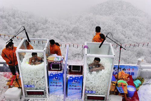 2011年1月3日,來自黑龍江的耐寒奇人金松浩和陳可財,在海拔1518.6米的天門山主峰云夢仙頂進行“冰凍活人”極限耐受力大比拼,兩人在冰天雪地的高山戶外被冰塊埋置頸部比拼耐凍的持久能力。最終,金松浩堅持時間長達120分鐘,成為世界第一“冰人”,陳可財也堅持到118分鐘,兩人雙雙打破吉尼斯世界紀(jì)錄。