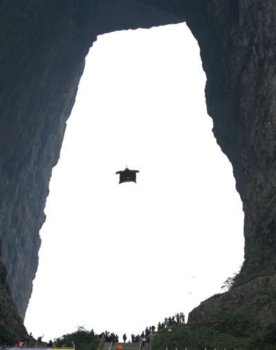 2011年9月24日,“2011翼裝飛行穿越天門”極限挑戰(zhàn)活動在天門山震撼上演。來自美國、意大利、芬蘭等6個國家的9名翼裝飛行高手分別以天門山索道轎廂、山頂懸崖為起跳點,進行了精彩絕倫的翼裝飛行表演。當(dāng)天,全球最頂尖的“翼裝飛俠”,來自美國的杰布・科里斯還成功挑戰(zhàn)人類首次無動力翼裝飛行穿越天門洞。1999,世界特技飛行大師駕機穿越天門,實現(xiàn)了人類首次駕機穿越自然山洞的奇跡。2011,“穿越天門”挑戰(zhàn)12年后再次呈現(xiàn),舉世震撼!