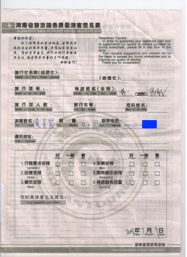 臺灣黃先生一行6人旅游質(zhì)量回饋