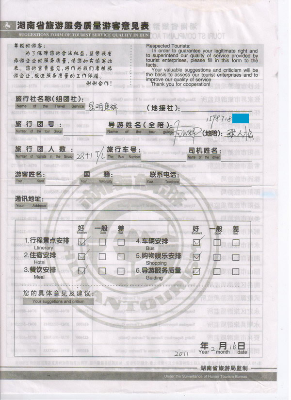 昆明康輝旅行社29人旅游質(zhì)量回饋