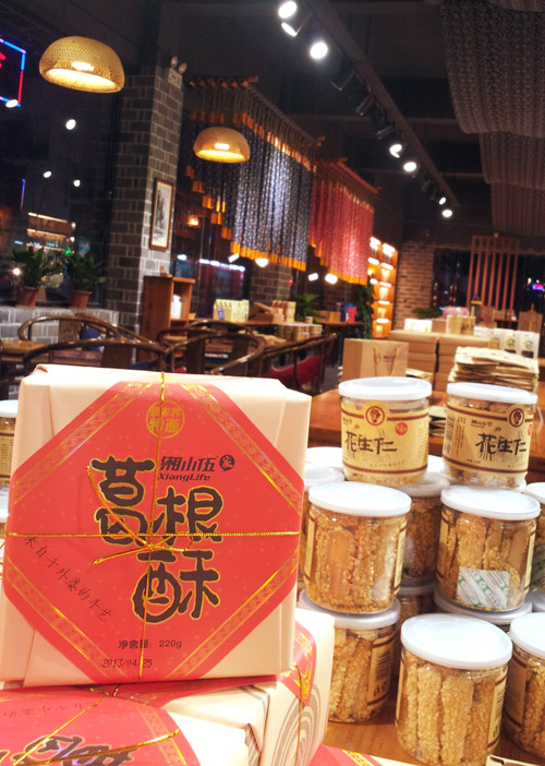 在我快遺忘這件事的時候,接到了小江的電話。小江說在張家界找了很多地方,才在湘小伍·家找到了我想要吃的葛根酥,也只有湘小伍·家才有這個產(chǎn)品。湘小伍·家除了有傳統(tǒng)的葛根粉,也有了新的產(chǎn)品——葛根全原粉,生產(chǎn)工藝是:山中挖掘——水洗表皮泥土——切片——烘干——將葛根片直接磨成300目的粉,此工藝保留了葛根的所有有用物質和微量元素。因為相對來說淀粉的比例變少,沖制時,不會成很稠的糊狀。為保證所有微量元素的價值,建議用攝氏100度的開水涼至80度時沖飲,效果最佳,而且葛根原本的香味更濃。為更方便食用,湘小伍·家用葛根粉、葛根全原粉與面粉按4:6的配比,研發(fā)了“葛根酥”產(chǎn)品,用烘培的方法,采用傳統(tǒng)的包裝形式,不僅風味獨特,而且民族特色鮮明,可算是最接地氣的張家界土特產(chǎn)品了,產(chǎn)品一上市,就得到了廣大市民和游客的認同與喜愛,產(chǎn)品極其暢銷。我很快收到了小江寄來的快遞,打開快遞一看見包裝就讓我愈發(fā)的想家,小時候過年走親戚帶禮品的老式包裝,懷舊的感覺讓我想起很多回憶,再拆開來品嘗一番,外婆手藝的味道也在嘴里蔓延……