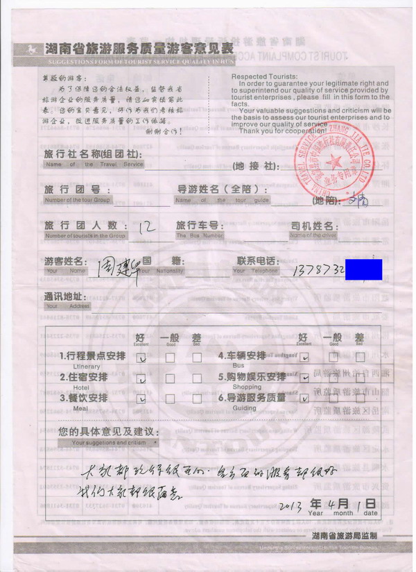 湖南周先生一行12人旅游質(zhì)量回饋單