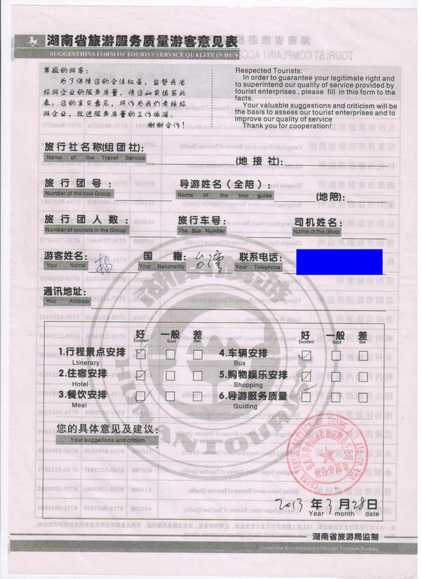 臺灣楊先生一行12人旅游質(zhì)量回饋單
