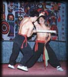 (4)銀槍刺喉:用一根兩頭安的鋒利槍頭的鋼槍,抵置于兩位表演者喉部,然后相對(duì)發(fā)力,至槍桿抵成彎弓形而喉部安然無恙。
