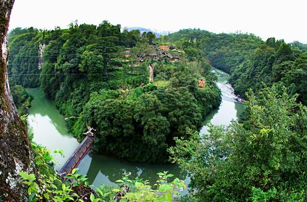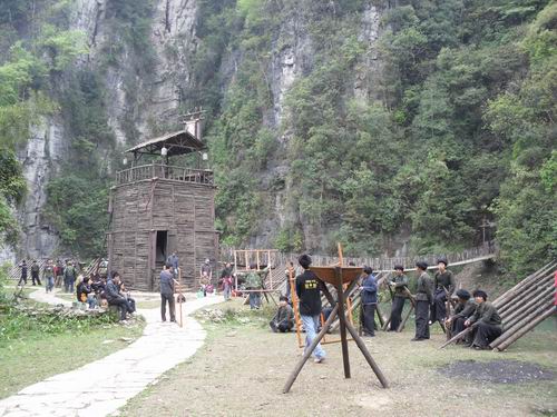 可以抽掉木板,斷掉追兵去路,具有戰(zhàn)略防御的功能。現(xiàn)在是苗族青年男女“趕邊邊場(chǎng)”(唱情歌、談戀愛(ài))的地方。大家順著我手指的方向看,苗王河邊的山腰上的兩個(gè)天然的溶洞口象兩只大眼睛,還有長(zhǎng)長(zhǎng)的鼻子,這就是傳說(shuō)中的“神象取水”了。現(xiàn)在我們到碼頭去坐游船,在苗王河泛舟,游覽苗王峽谷的山水風(fēng)光。